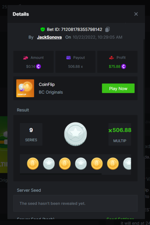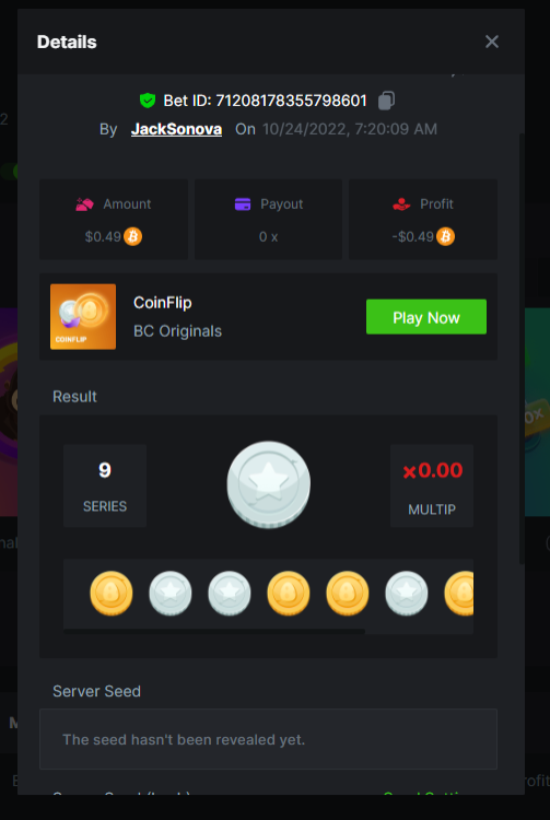 4. Bounty qualified first post/edit: Bet ID: 71208178355798142 https://bc.game/#/sd/10VLM0T0UNY2AB I noticed for the bounty entry (1st one) the amount says $0.14 even though I bet $0.15 USD equivalent as required, but just to be sure so that it qualifies for bounty and meets requirements, here's a screenshot of the game just ending showing it was $0.15 for the bet amount Bet ID 71208178355798421 https://bc.game/#/sd/10VQ7FGVYWP24Z Bet ID: 71208178355798601 https://bc.game/#/sd/10VQ8G1CQMPUS3