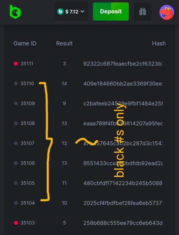 5. Hii I was able to catch 6/7 black #s: https://hash.game/#/sd/11H3SWQL5XNI8N https://hash.game/#/sd/11H3T1DA8ZIIGJ https://hash.game/#/sd/11H3T2JC2GUIWR https://hash.game/#/sd/11H3T3HM5QSNOZ https://hash.game/#/sd/11H3T40JCE9TSN https://hash.game/#/sd/11H3T4IGU1PFRR
