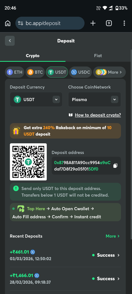 Warrior777 Posted 9 hours ago Share Posted 9 hours ago Hi Team, I had deposited USDT on Plasma network in bc.game but it was not credited. Time: 2026-03-09 20:23:59 Receiving: 55.233757 USDT Network fee: 0.1 USDT Network: Plasma (USDTO) Withdrawal address: 0x8798A811A90cc9954a9aCdaf7D8f29a05f015Df0 TXID: 0xa64f23d0b8544cb77a88211d2904c43457e5129c660f701d88582a97926f4c70 Plasma network - https://plasmascan.to/tx/0xa64f23d0b8544cb77a88211d2904c43457e5129c660f701d88582a97926f4c70 I have contacted the bc.game live support but they keep asking for order id but it was not generated. I request the team to please look into the issue, the attached screenshot and plasma network and credit the USDT to my account. My userid is 1046452 Warrior777 Regards Link to comment Share on other sites More sharing options...